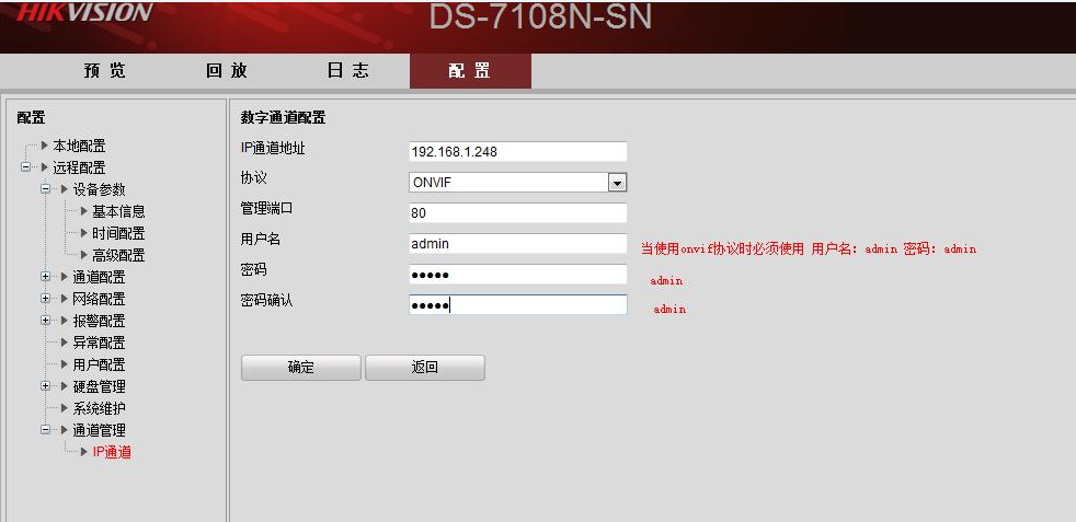 密码:admin (这里的密码必须是admin,如果摄像的头登录密码更改了,那这里密码还需要输入admin,因为大华的使用ONVIF协议对接时默认的用户名就是admin 密码也是admin)